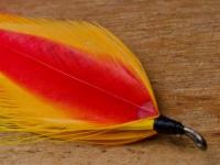 Now I had feathers that were flat. I picked out two large yellow feathers for each side and a smaller red one. I stripped off the barbs to match them to the hook length and each other and I was ready to roll.
