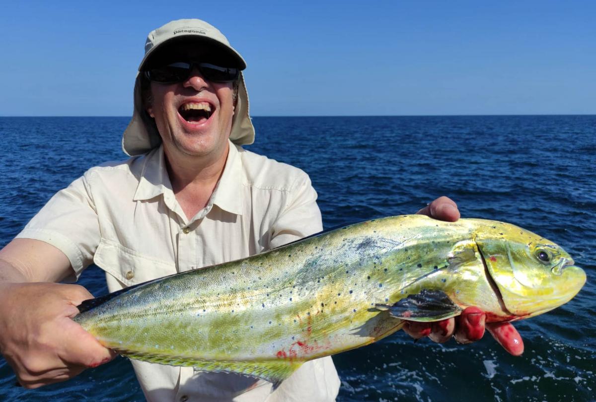 We spotted a single fish. Francesco explained to me that the dolphin is around in schools and sometimes these schools send out scouts to look for bait. So, he started to cast his jig far out and reeled in extremely fast and this approach was effective in getting them close. The first school came in. The fish are stunningly beautiful, and they move wicked fast. I offered a popper, tied according to Bob Popovics’s Banger. No interest, Francesco took a fish on a soft rubber in chartreuse and orange. For the next school I tried a chartreuse deceiver and one fish liked it enough to take it.