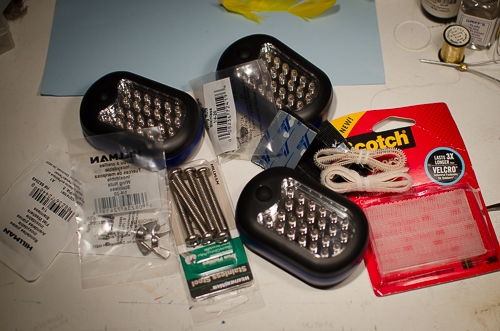 The hardware required is simple. Three 24-LED battery powered lights ($3-$4 apiece online), a couple 1/4-20
