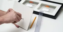 Another way of creating such accents is by cutting thin grooves in the matte. If you have selected a colored matte, cutting these grooves will reveal the white core of the cardboard and create nicely contrasting lines. Grooves in a uniformly white board will show themselves as discrete shadows, also lending a distinct elegance to the frame.
