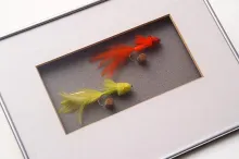 Photos, prints or drawings are an obvious supplement to the flies. They are easy to mount above or next to the fly or flies in a separate opening. A fly and a picture of the fish it caught is a perfect combination. Bas Verschoor's framed stamps and flies is a good example of a series of conceptually connected flies in combination with extra elements - in this case the stamps.
