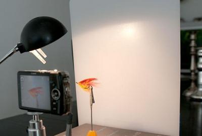 If you have one lamp, simply put it right over the fly slightly to the front of the fly and as close as possible but without getting any part of the lamp in the picture. Make sure you have no shadows or reflections on the background.