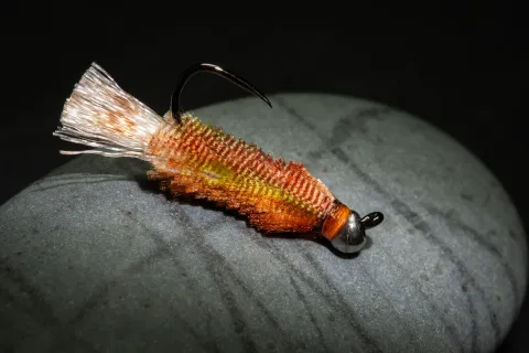 - Tie in the fibres by the middle on top of the hook behind the bead.