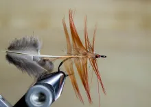 tying the fly is pretty straightforward. The tail is GP, the body hackle is palmered and secured with the rib and the front hackle is also GP, selected and tied in to sweep over the body in its full length and a bit, the tips almost reaching the tip of the tail, and giving the fly a lot of movement in the water.