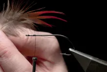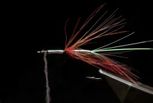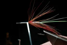 The Djihad is a bright fly with a shiny body, silver combined with black and red. Just my kind of fly. I like the Irish Shrimp tradition flies, and this is such a fly on steroids. It even uses one of my favorite materials: Golden Pheasant.