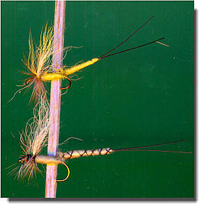 Two Flex-Hex's. Top: dun with yellow body and wing. Bottom: spinner with cream body and tying thread pattern.