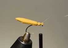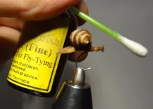 This simple pattern by Russian fly tyer Dmitri Tseliaritski is another example of his ability to make an almost perfect imitation using simple materials and methods. This is a floating snail made from foam, and it requires very little apart from that. Hook, thread, glue, mono, some markers and a final layer of LCR and you have a fine imitation. Sure, this fly will ride upright or tilted in the surface where many snails actually hang with the house down, inverted on the underside of the water, but it will work, presenting the fish with the right silhouette.