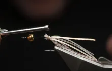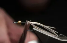 The original fly is tied with the rubber legs “midships” just covering the hook point. This was done to eliminate the fish nipping the legs and not finding the hook. In sea trout fishing that’s rarely a problem, so I have used a shorter shank hook and moved the bead to the rear, to just where the hook bend starts. I also leave the legs fairly long in order to keep the looks of a shrimp or squid. They can of course be tied shorter or trimmed if you fear fish nibbling the rubber legs and not striking the hook point.