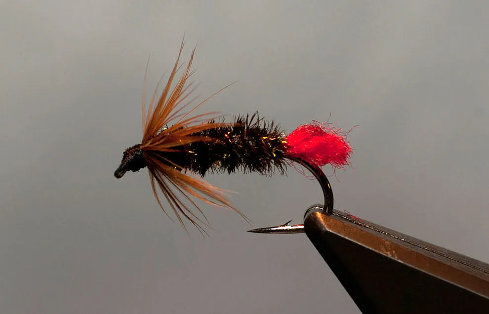 This Red Tag uses few materials, which are very useful in many patterns: red wool, copper rib, peacock herl and soft, brown hen hackle