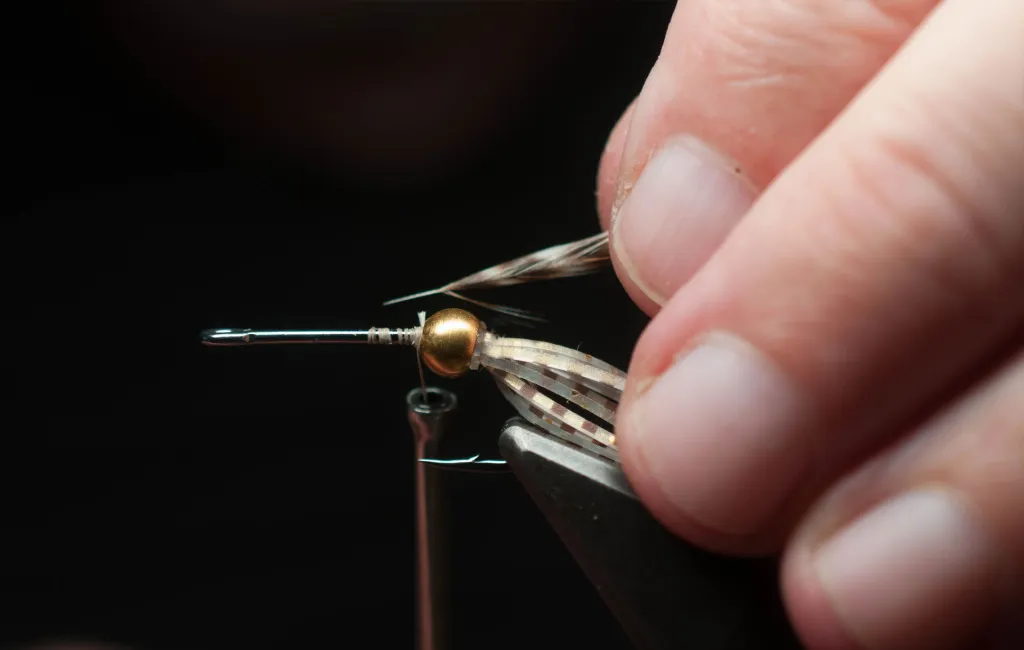 Strip the barbs off the base of a dry fly hackle and tie in right in front of the bead