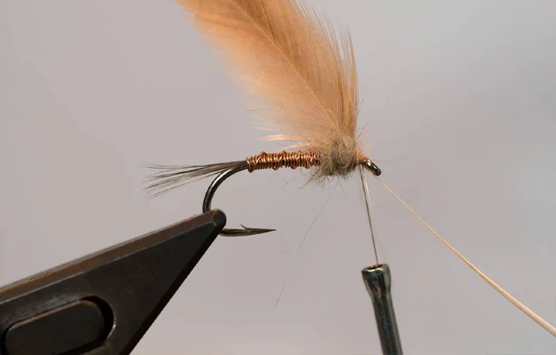 Tie n the feather by the stem, curved side forward