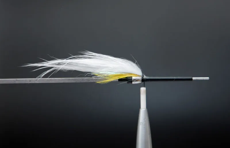Tie in the main wing of white rabbit. A good tip is to cut the skin to a point both in front and rear.