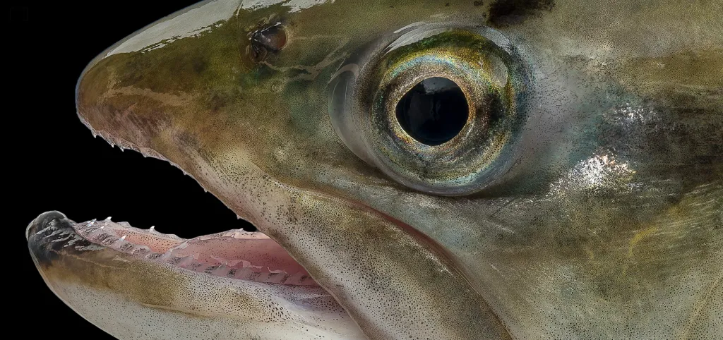 The eye of a trout really close. On the site scaledup.life you can zoom in even further and almost fill the whole screen just with the eye.