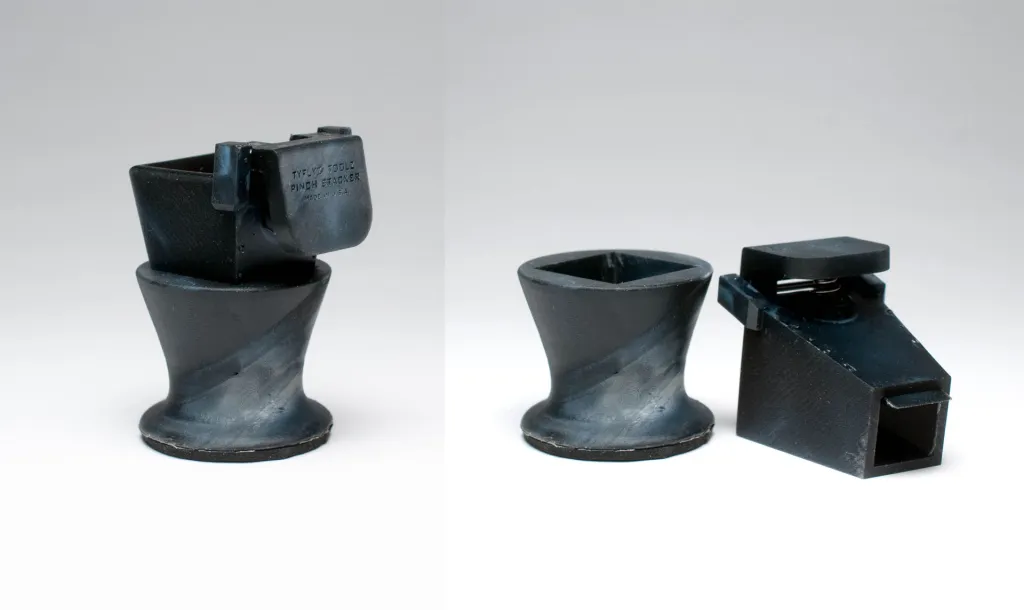 This stacker with a pinching mechanism is 3D-printed, and the finish is not exactly perfect.