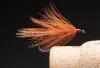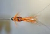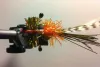 This muddler is tied on a small stainless Mustad hook using orange deer hair, orange dyed grizzly hackle and natural rabbit dubbing with a bit of orange flash mixed in. A small beauty indeed and sooo easy to see at night.