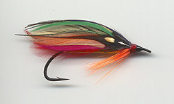 From bottom to top - pink swan, orange swan, four strands of peacock herl, green swan, hyacinth macaq, on each side a red cock hackle |